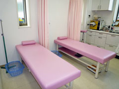 広々とした明るいリハビリ室には、ウォーターベットや頚部・腰部牽引器、低周波、干渉波、マイクロ波などの各種リハビリ機器を備えております。