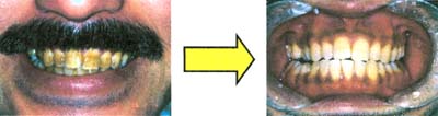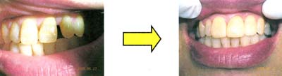 歯の表面を0.4ミリほど削り、セラミックを貼り付けます。これは上記ホワイトニングで白く出来ない歯の芯からの着色や歯の隙間をなくす有効な方法です。