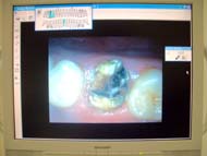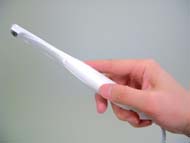 治療前後のお口の状態を細長いカメラ(写真左上)で撮影し、 診察台の目の前のモニターでご覧頂いております。